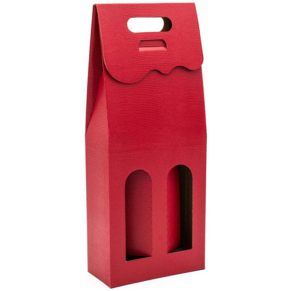 Kartonowe opakowanie z okienkiem wykonane z 3 warswowego papieru kaszerowanego w kolorze czerwonym. Opakowanie na 2 butelki wina.