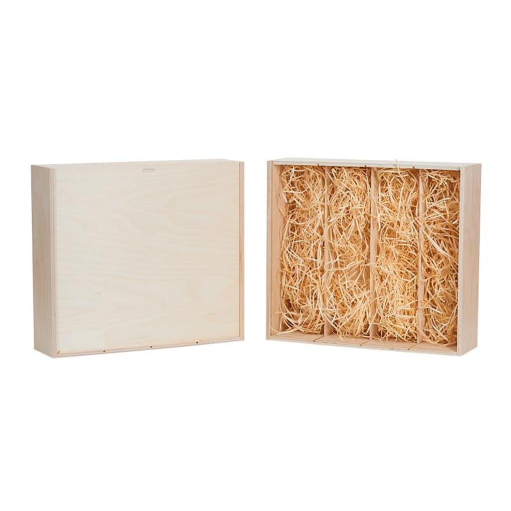 Drewniana skrzynka na cztery butelki wina wykonana z drewna sosnowego. Skrzynka wypełniona wełną drzewną.